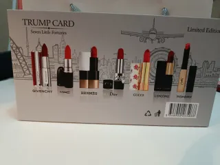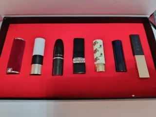 Conjunto de labiales de diferentes marcas y diseños. - Estuche de terciopelo rojo. - Diseño floral con detalles dorados. - Acabado mate y brillante.