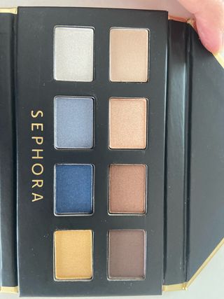 Estuche de sombras de ocho colores en tonos tierra, dorados y azules. Sin estrenar