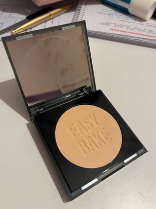 Polvos compactos Huda Beauty Easy Bake en tono peach pie. El producto se presenta en su estuche original con espejo. Con caja. Ideal para sellar el maquillaje, acabado mate.