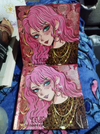 Paleta de sombras y coloretes con un diseño artístico. - Estuche con ilustración. - Tonos dorados y rosados. - También tonos con purpurina de distintos colores