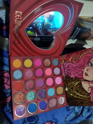 Paleta de sombras de ojos con un diseño vibrante y colorido. - Incluye una variedad de tonos para crear diferentes looks. - Presentada en un estuche metálico con estampado de arcoíris.