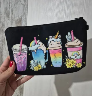 Neceser con un divertido estampado de bebidas estilo kawaii, perfecto para llevar tus esenciales. - Diseño multicolor sobre fondo negro. - Cierre de cremallera. - Ideal para maquillaje o pequeños objetos. Hago envíos o entrego en Alicante, zona pla de la vallonga, no me desplazo
