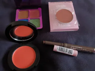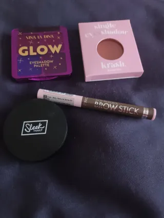 Lote de maquillaje variado, ideal para renovar tu neceser. - Paleta de sombras con cuatro tonos. - colorete en crema. - Un lápiz para cejas. -Sombra krash