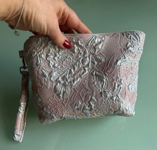 Neceser elegante y sofisticado realizado en tejido jacquard bordado con relieve floral, en tono rosa empolvado con detalles metalizados efecto plata. Muy femenino y de acabado alta gama. Ideal para cosmética, maquillaje, cremas, perfume pequeño o básicos de viaje. 💎 Detalles: • Interior forrado satinado • Cierre con cremallera • Asa de mano desmontable 📏 Medidas: Ancho arriba 22 cm | Ancho abajo 17 cm | Altura 15 cm 📌 Pieza especial, estilo boutique, difícil de encontrar. 📩 Escríbeme si quieres más fotos o envío.