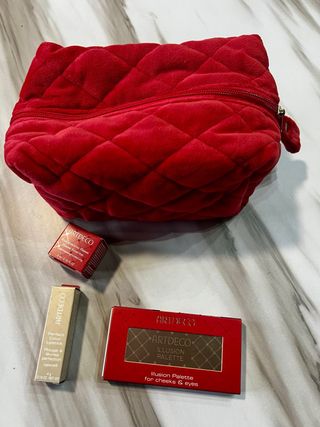 Pack maquillaje. Paleta iluminador y sombras de ojos. Labial perfect color, tono 803, rojo. Prebase para sombras de ojos. Neceser color rojo. Marca Artdeco. Nuevo, nunca abierto. No se vende por separado. #maquillaje #beauty #marca #artdeco #nuevo #paleta #iluminador #prebase #sombraojos #eyeshadow #neceser #rojo #rouge #red #rebajas #labial #lip #brillo #makeup
