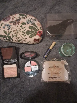 Lote de productos de belleza de varias marcas reconocidas. - Neceser transparente con lentejuelas y adornos. - Base de maquillaje o iluminador en tono dorado y rosado. - Sombra de ojos compacta. - Mascara de pestañas. - Mini talla de loción o tratamiento facial. - Dos tarros pequeños de crema o bálsamo.