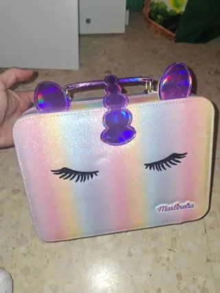 Neceser con un diseño de unicornio muy llamativo y brillante. Medidas 25cm ancho,18cm alto y 10cm fondo, maquillaje sin usar - Estampado de arcoíris con purpurina. - Detalle de pestañas y cuerno de unicornio. - Cierre de cremallera.