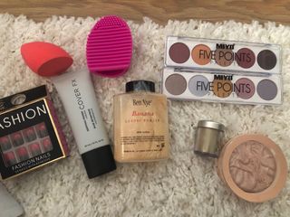25 productos nuevos a estrenar, el único que está a mitad son los polvos banana de Ben nye. - Paleta de sombras MIYO Five Points. - Polvos Banana Ben Nye. - Base de maquillaje Cover FX. - Guante de bronceado SoSu Luxury Velvet. - Uñas postizas Fashion Nails. - Brocha para limpieza de maquillaje. - Esponja de maquillaje. - Paleta de sombras naranja. - Iluminador compacto. - Varias sombras de ojos individuales en tonos vibrantes y tierra. - Neceser plateado MEMI.