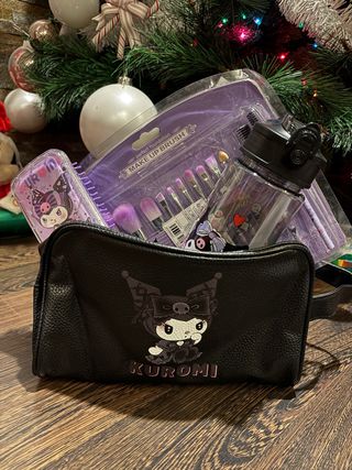 Conjunto de artículos temáticos de Kuromi. - Neceser negro con diseño de Kuromi. - Botella de agua reutilizable. - Set de brochas de maquillaje en empaque morado. - Peine de puas