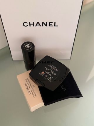 Conjunto de productos de maquillaje de la marca Chanel. Incluye varios artículos para un look completo. Maxi poudre Pincel kabuki Maquillaje teint ultra nº30 Sombra ojos azul/gris Mascara pestanas Rizador pestañas Chanel Labial rojo Neceser