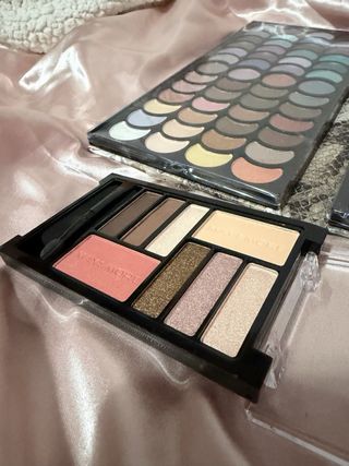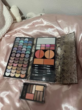Estuche de maquillaje con una variedad de sombras de ojos y labiales. - Incluye espejo. - Incluye un conjunto de pinceles. - Variedad de tonos y acabados. - Aplicadores de sombra.