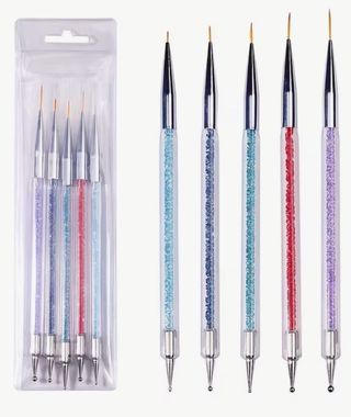 Set de 5 pinceles para decoración de uñas con mangos de cristal. Incluye diferentes tamaños para mayor versatilidad. - Pinceles con mango de cristal brillante. - Variedad de puntas para diferentes diseños. - Longitud de los pinceles: 5.51in. - Tamaños de punta: 0.2in, 0.27in, 0.35in, 0.43in, 0.51in. - Diámetros de punta: 0.04in, 0.08in, 0.05in, 0.1in, 0.11in.