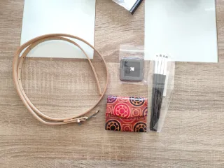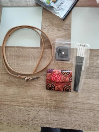 Conjunto de bolso negro con detalle dorado y un set de pinceles de maquillaje con sombra de ojos negra. Cinturón finito color beige+ minimonedero - Bolso pequeño con cierre de solapa,con tassel decorativo dorado. - Incluye 4 pinceles finos de maquillaje. - sombra de ojos negra. - cinturón fino de color beige. Todo está nuevo sin uso en perfecto estado.