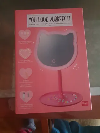 Espejo de maquillaje con forma de gatito, ideal para tu tocador. Cuenta con luz LED integrada para una mejor visibilidad. - Brillo ajustable. - Luz blanca fría. - Botón táctil ON/OFF/dimmer. Está totalmente nuevo lo tenemos por duplicado en tienda cuesta 19,90€