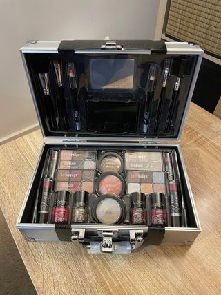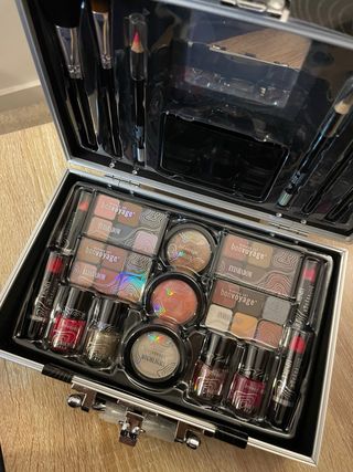 Maletín de maquillaje Bonvoyage con 43 piezas. Ideal para llevar tus esenciales de belleza. - Incluye sombras de ojos, labiales, esmaltes y brochas. - Diseño compacto y organizado en un maletín plateado. Está nuevo. Sin abrir.
