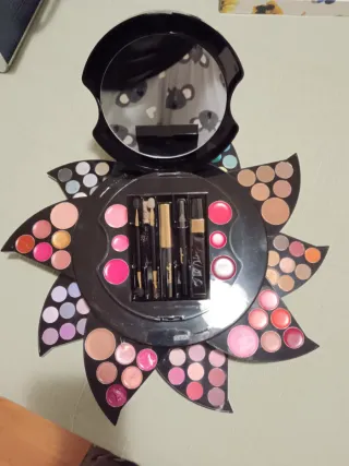 Paleta de maquillaje con un diseño único en forma de flor. - Incluye sombras de ojos y brillos labiales. - Espejo integrado en la tapa superior. - Variedad de tonos para crear diferentes looks.