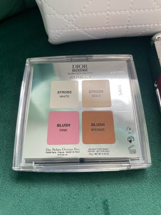 Pack / Set de maquillaje Dior. 1. Neceser blanco acolchado. 2. Paleta Backstage - Glow Face Palette 001 Universal 3. Labial Dior Addict Lip Maximizer - 026 4. Colorete Dior Rosy Glow - 001 Pink Total del set en tienda: 155 euros