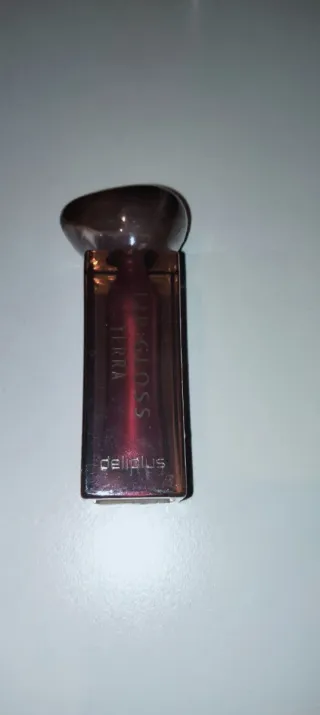Brillo de labios de la marca Deliplus, tono rojo burdeos - Envase transparente con tapa oscura.