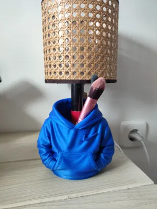 Original porta brochas con diseño de sudadera. - Color azul vibrante. - Detalle de bolsillo frontal. - Incluye dos brochas de maquillaje.