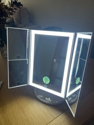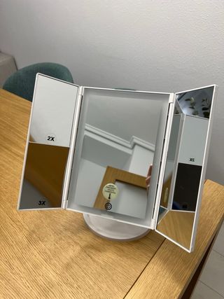 Espejo de maquillaje con iluminación LED integrado. Ideal para aplicar maquillaje o realizar rutinas de cuidado facial. Muy poco uso, esta como nuevo y con el cable de carga incluido. - Diseño tri-fold con paneles laterales ajustables. - Iluminación LED brillante alrededor del espejo principal. - Base estable para colocar sobre superficies. - Ampliación 2X y 3X en los paneles laterales y un supletorio de 10X. - Cable de carga USB