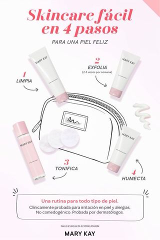 Rutina de skincare Mary Kay en 4 pasos para una piel feliz. Ideal para todo tipo de piel. - Limpia - Exfolia (2-3 veces por semana) - Tonifica - Humecta - Clínicamente probada para irritación y alergias. - No comedogénico. Probada por dermatólogos. - los precios barian depende el producto