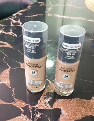 Dos bases de maquillaje Revlon Colorstay con acabado natural. - Tono: 180 Sand Beige. - Duración: 24 horas. - Protección solar: SPF 20. - Ideal para piel normal/seca.