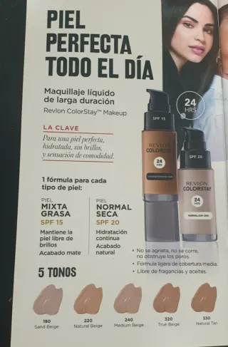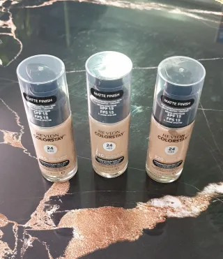 Tres botellas de maquillaje Revlon Colorstay con acabado mate. - Diseñado para pieles mixtas/grasas. - Protección SPF 15. - Cobertura de larga duración (24 horas). - Tono: 330 Natural Tan.