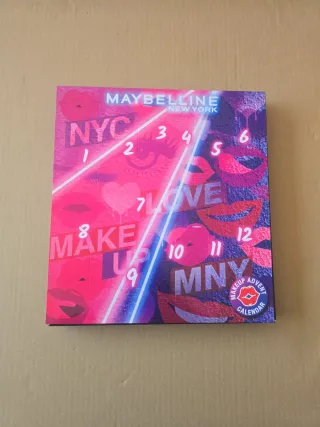 Calendario de Adviento de Maquillaje de Maybelline. - Diseño vibrante con temática de Nueva York y labios. - Números del 1 al 12 para contar los días.