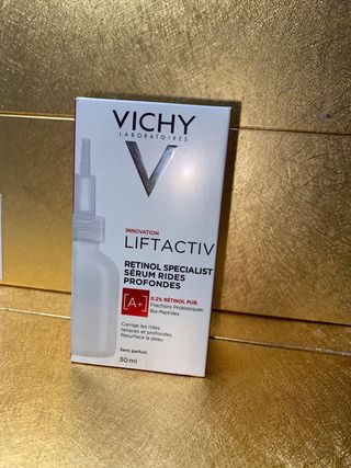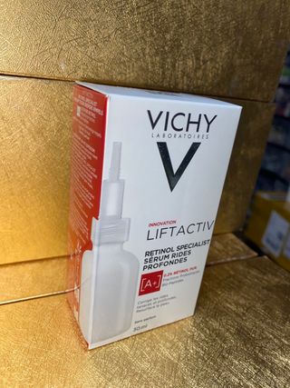 Sérum facial Vichy Liftactiv con Retinol Puro. - Contiene 0.2% de Retinol Puro. - Formulado con fracciones Probióticas y Bio-Péptidos. - Corrige arrugas tenaces y profundas. - Ayuda a resurface la piel. - Formato de 30 ml. - Sin perfume.