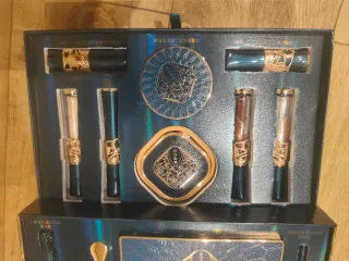 Este es un kit de maquillaje de la marca Vintage Beauty. Incluye varios productos de belleza con un diseño elegante. - Incluye delineador de ojos, polvo fijador y labial. - Diseño con detalles dorados y azules.