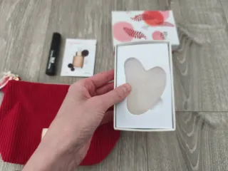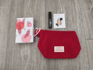 Set de belleza Clarins que incluye un neceser, una máscara de pestañas, una piedra Gua Sha y una muestra de maquillaje. - Neceser de color rojo con textura acanalada. Nuevo con etiqueta. - Máscara de pestañas Wonder Volume Mascara XXL negro. Nuevo. - Muestra de Skin Illusion 111N. Nuevo. - Piedra Gua Sha. Nuevo.