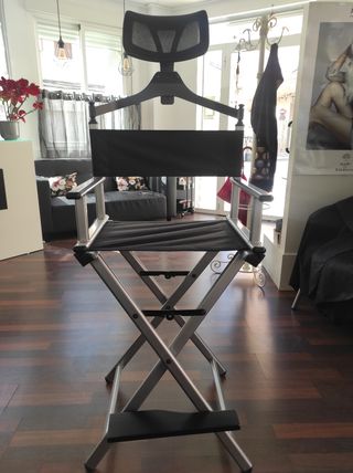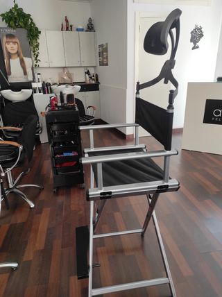 Preciosa silla de maquillaje plegable, ideal para profesionales o uso doméstico. Se encuentra en muy buen estado. - Estructura de aluminio. - Asiento y respaldo acolchados. - Reposacabezas regulable. - Incluye reposapiés.