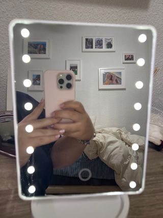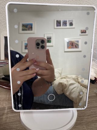 Espejo de maquillaje con luces LED integradas. Perfecto para tu tocador. - Diseño moderno con marco blanco. - Base estable para colocar en cualquier superficie. - Luces LED circundantes para una iluminación uniforme.