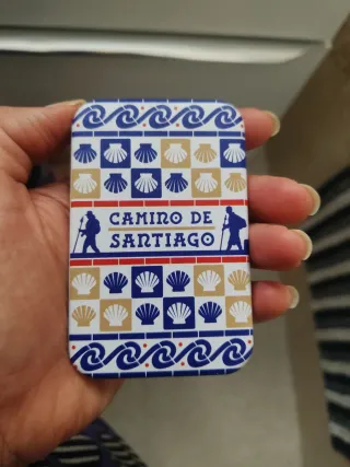 Espejo de mano compacto con diseño inspirado en el Camino de Santiago. Ideal para llevar en el bolso o neceser. - Doble cristal. Uno para verse en tamaño normal y otro con aumento. - Diseño con conchas y motivos marineros en azul y blanco.