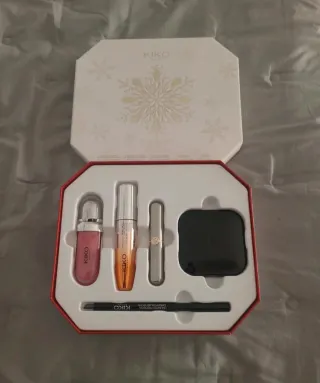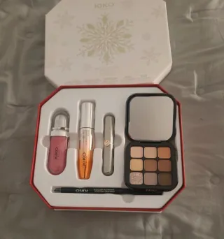 Estuche de maquillaje Kiko Milano con varios productos. - Incluye brillo de labios. - Máscara de pestañas. - Lápiz de ojos. - Un pequeño espejo.