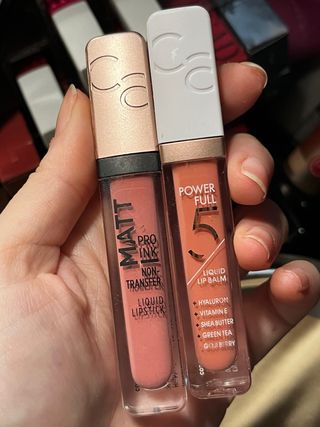 Dos labiales líquidos de la marca Catrice. Uno es acabado mate y el otro es un bálsamo labial. - Labial líquido Matt Pro Ink no transferible. - Bálsamo labial Power Full 5 con ácido hialurónico, vitamina E, manteca de karité, té verde y bayas de goji. Dos labiales mate Dapop
