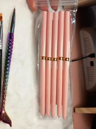 Set de siete pinceles para decoración de uñas con mangos rosas y detalles dorados. Incluye un pincel con diseño de cola de sirena. - Mango de color rosa. - Detalles metálicos dorados. - Pincel con diseño de cola de sirena.
