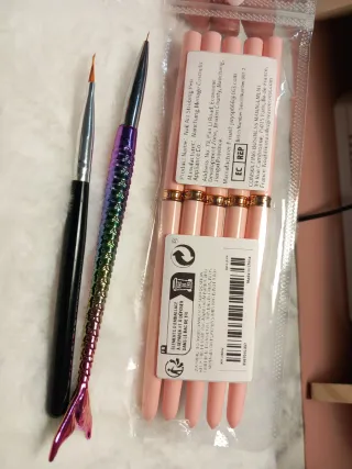 Set de 5 pinceles para decoración de uñas. - Mangos de color morado brillante. - Virola y detalles metálicos en tono dorado.