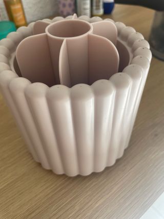Práctico organizador para brochas de maquillaje con un diseño moderno. - Material: Plástico resistente. - Color: Beige/Rosa. - Diseño acanalado.