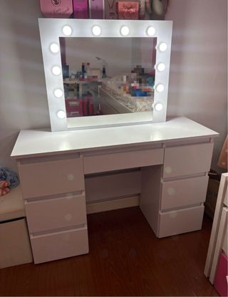 Preciosa tocador de maquillaje en blanco, en muy buen estado. - Incluye espejo con luces LED. - Dispone de varios cajones para guardar tus cosméticos y accesorios. - Diseño elegante y moderno, ideal para cualquier dormitorio.