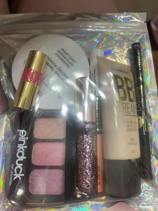 Conjunto de maquillaje variado con productos de diferentes marcas. - Pinta labios pequeño de yves sant laurent - Paleta de sombras de ojos Pinkduck con tres tonos. - BB Cream DDONNA Lasting. - Lápiz de ojos BLEU. - Polvos compactos matificantes. - Brillo de labios con purpurina.