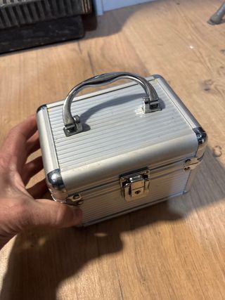 Maletín de aluminio con acabado plateado, ideal para organizar y transportar maquillaje. - Diseño compacto y ligero. - Asa superior para fácil transporte. - Cierre de seguridad. Espejo interior rajado