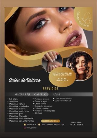 Ofrezco: • Maquillajes profesionales para todo tipo de ocasiones 💄 • Clases de automaquillaje personalizadas 💋 • Clases de iniciación a uñas acrílicas 💅 • Clases de Nail Art y decoración de uñas 🎨 Me desplazo por toda Granada y alrededores para ofrecer mis servicios a domicilio. Trabajo con productos de calidad, adaptados a cada persona, y doy atención totalmente personalizada. 📅 Disponibilidad: fines de semana y fechas especiales. 📩 Escríbeme y reserva tu cita o clase sin compromiso 💖