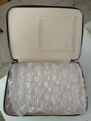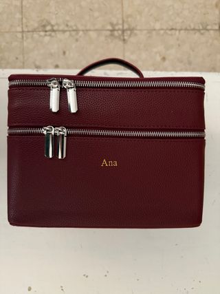 Elegante estuche de maquillaje en color burdeos, con un diseño de dos compartimentos. - Compartimento superior con doble cremallera. - Compartimento inferior con doble cremallera. - Asa superior para facilitar el transporte. - Esta personalizado. (Como se ve en las fotos) Lo vendo porque me compre otro mas pequeño. Medidas: Ancho 25cm Alto 18cm