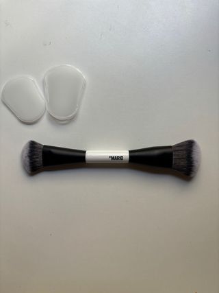 Brocha de maquillaje de la marca by Mario. - Diseño de doble extremo. - Mango en color negro y blanco. En tienda tiene un precio de 38€ y está totalmente nueva, sin estrenar