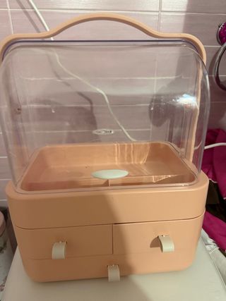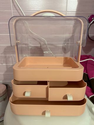 Práctico organizador de maquillaje con compartimentos y cajones. - Diseño moderno y funcional. - Acabado en tono rosa suave. - Tapa transparente para proteger tus productos.