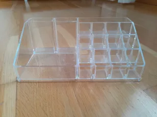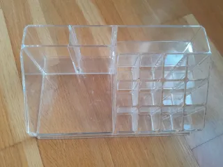Práctico organizador de acrílico transparente para maquillaje y accesorios. - Múltiples compartimentos de diferentes tamaños. - Diseño escalonado para fácil acceso. - Material acrílico resistente y fácil de limpiar. Medidas largo 22 cm. Alto 8 cm. Fondo 13 cm.