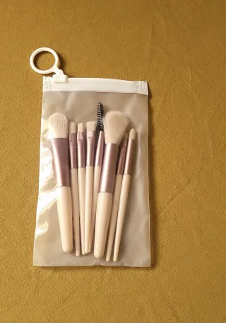 Set de brochas de maquillaje con mangos en tonos beige y detalles dorados. Incluye un práctico neceser transparente para guardarlas. - Incluye varias brochas de diferentes tamaños y formas. - Neceser con cierre de cremallera y asa. - Diseño elegante y funcional.