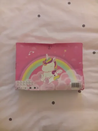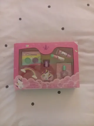 Set de maquillaje y colonia con temática de unicornio. Incluye varios artículos para un look divertido. - Paleta de sombras de ojos. - Dos brillos de labios. - Eau de Toilette. - Esmalte de uñas.