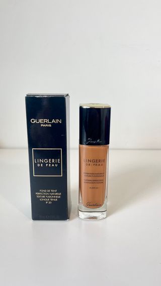 Base de maquillaje Guerlain Lingerie de Peau en tono marrón. Ofrece una cobertura natural y acabado mate. - Tono: 05N - Acabado: Natural - SPF: 20 - Contenido: 30 ml